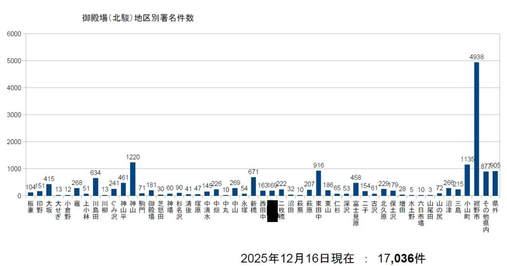 2025年12月16日までの1ケ月超間に集計された「北駿地区の医療を考える会」救急総合病院建設を求める署名は17,036、17000名を超えました。16日間で509署名が集計し終わりました。裾野市、二子区が多く集計されました。20000署名まであと3000となりました。